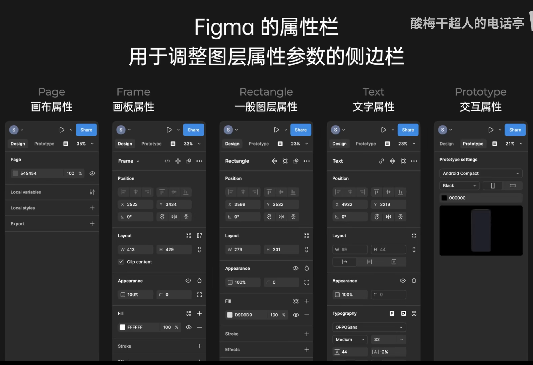 Figma的属性栏核心模块包括:图层操作、位置、布局、外观、填充、描边、效果和导出。