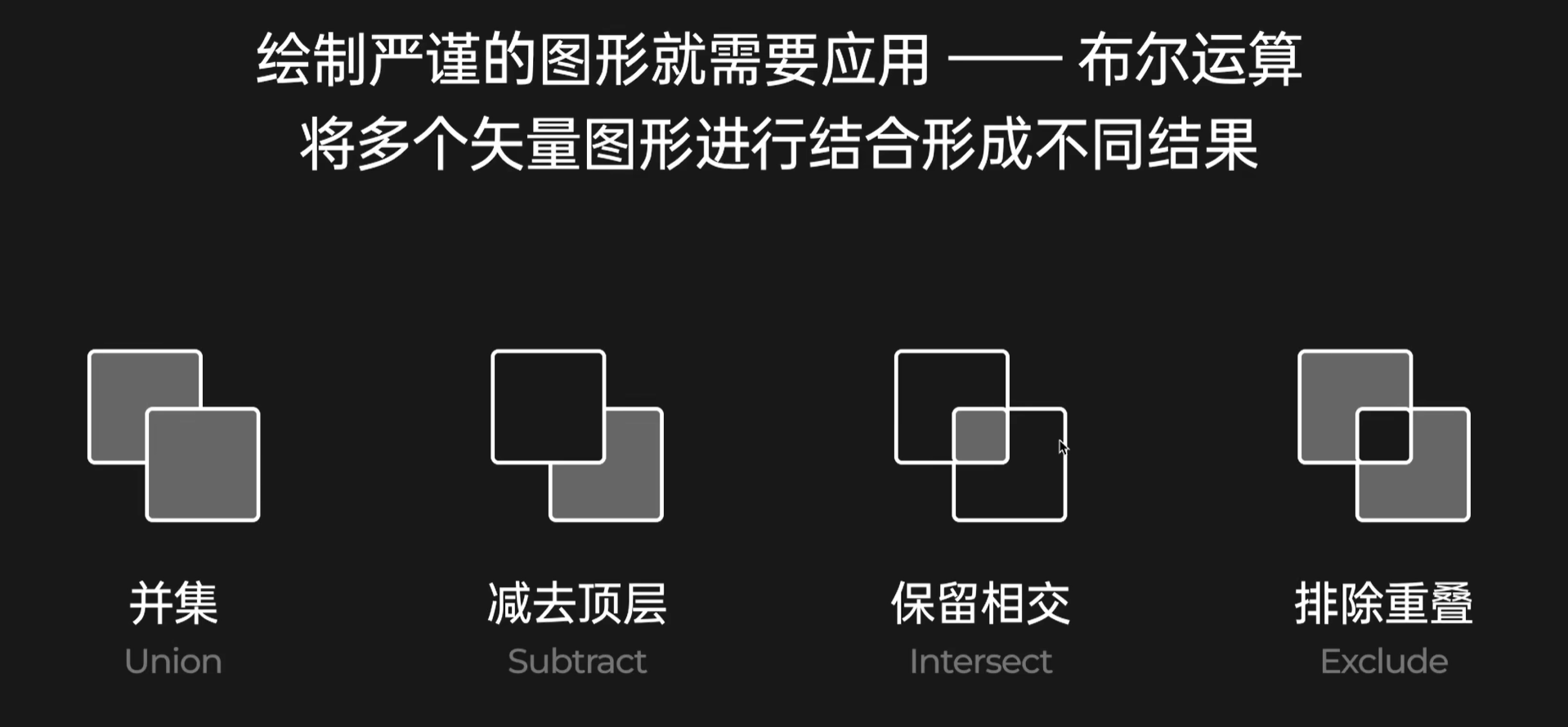 | 交集 (Intersect) | ∩ | 保留相交部分 | 获得两个元素之间相交的部分作为一个结果,其他部分被裁切掉。 |