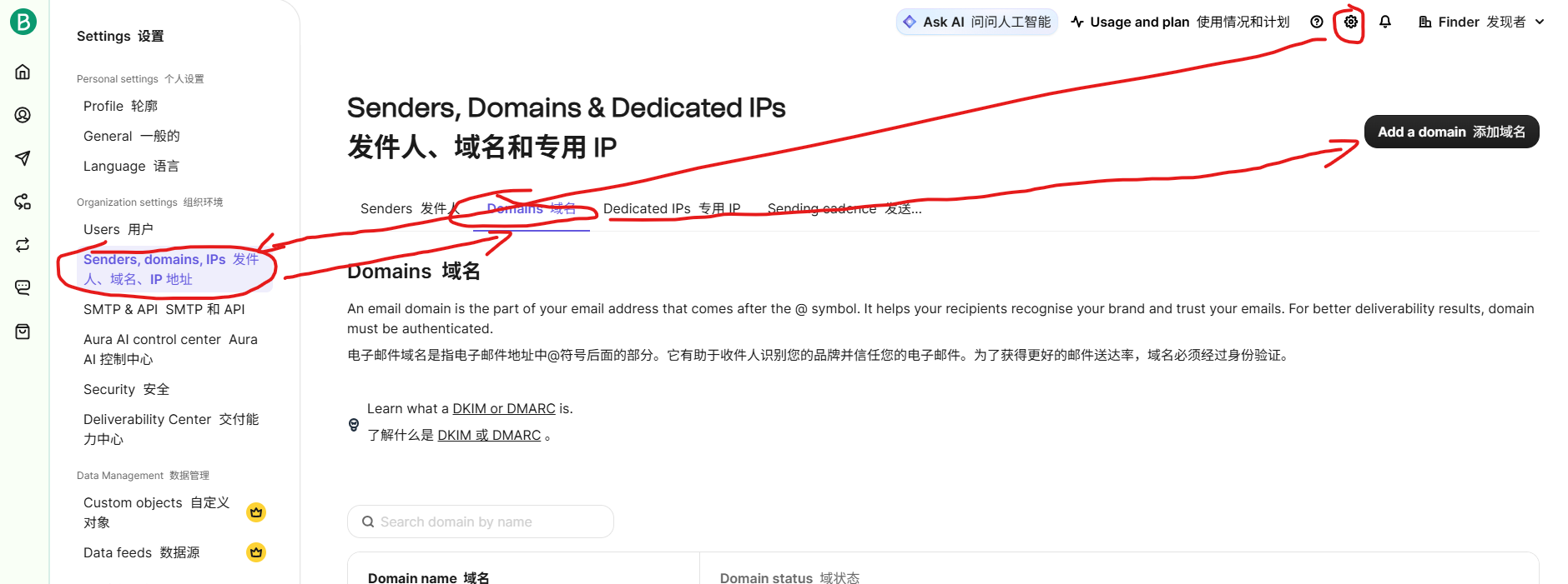 步骤二:在 SMTP 服务商添加Domains(以Brevo为例) #