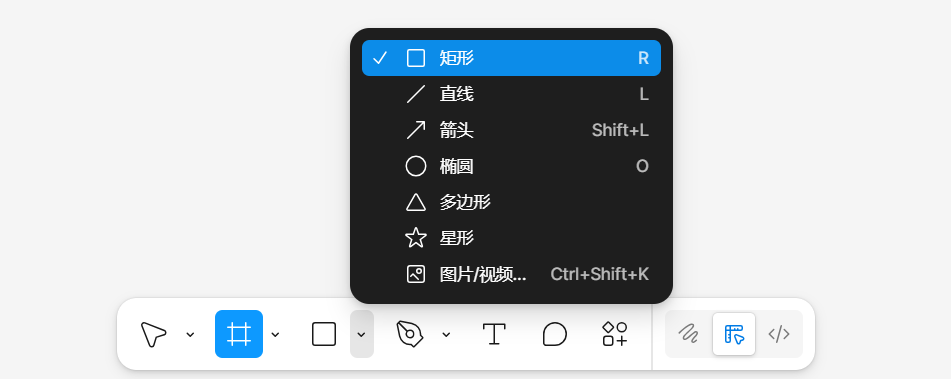 | 画板/框架 (Frame Tool) | F | Figma 中非常重要的编组类型。 | 选中后,可以在右侧看到内置的画部(如iPhone或桌面尺寸)供快速创建。也可以单独拖拽创建自定义画板。 |