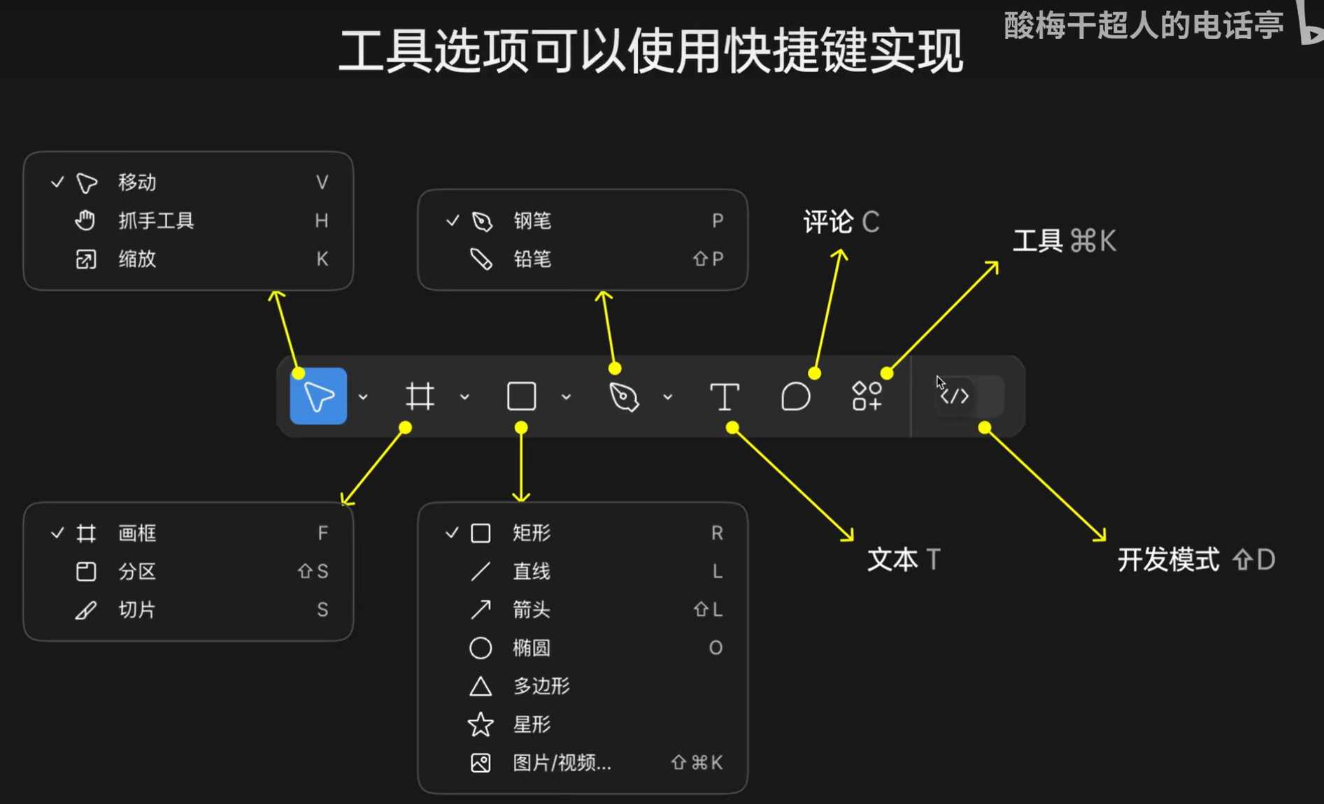 | 切图工具 (Slice) | S | 框选一个区域,专门用于导出图像。 | 在今天的协作环境里基本不会用到,可以暂时略过。 |