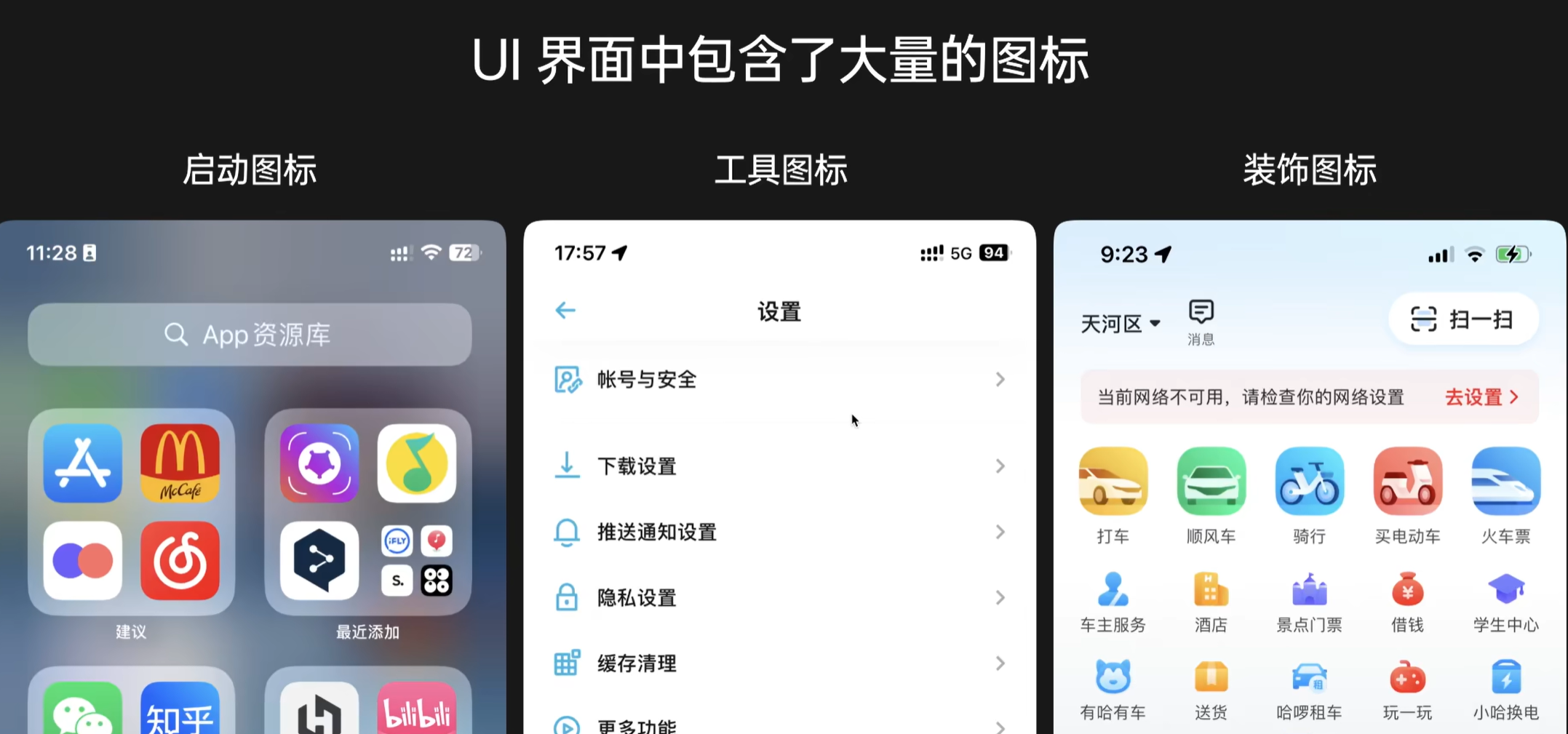 - 作用: 带有一定的寓意,通过简单的图形符号(如播放、分享、暂停按钮)带来使用上的便利性。