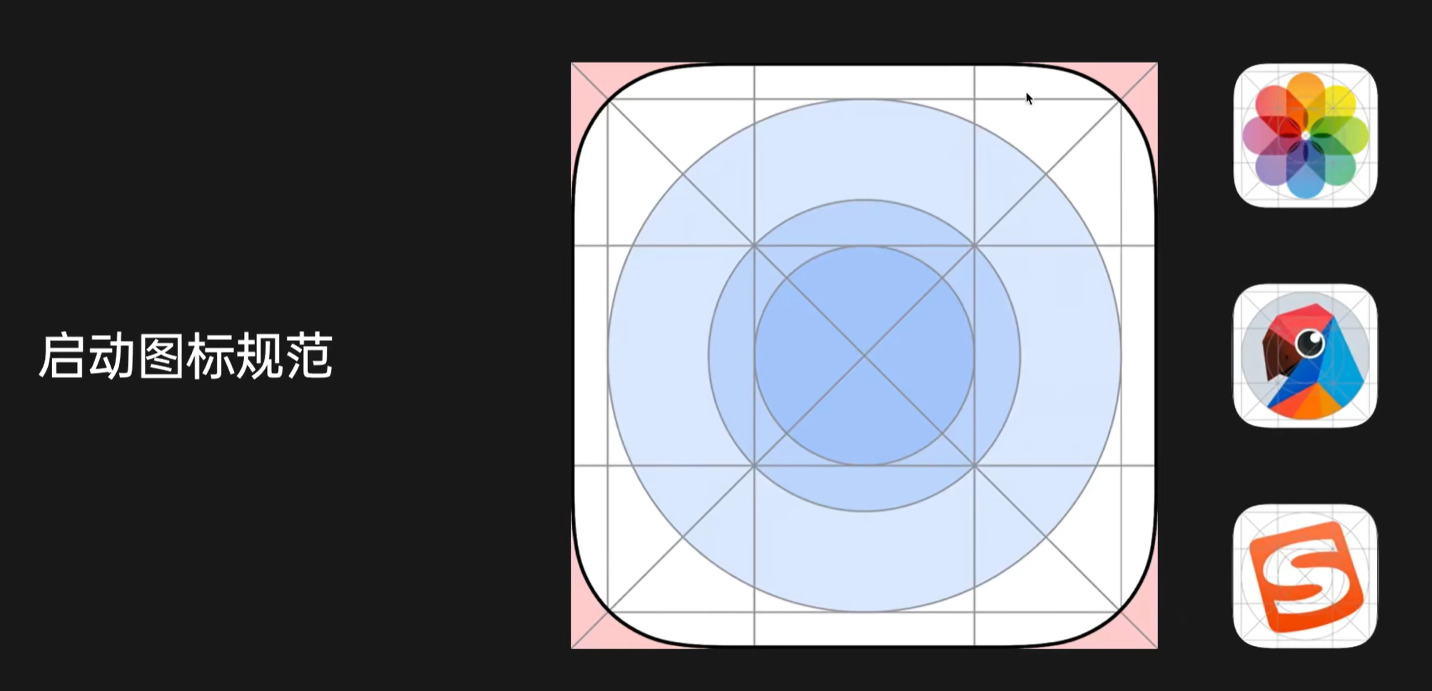 - 规范: 苹果官方提供了模板。导出时,设计师只需提供一张 1024 x 1024 的正方形图片。最终的圆角效果由官方系统(苹果或安卓)说了算。