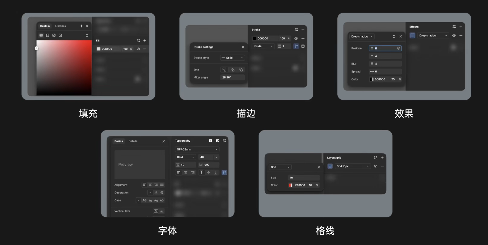 - 定义: 样式是对 Figma 属性面板中不同功能模块的参数进行的一种定义。